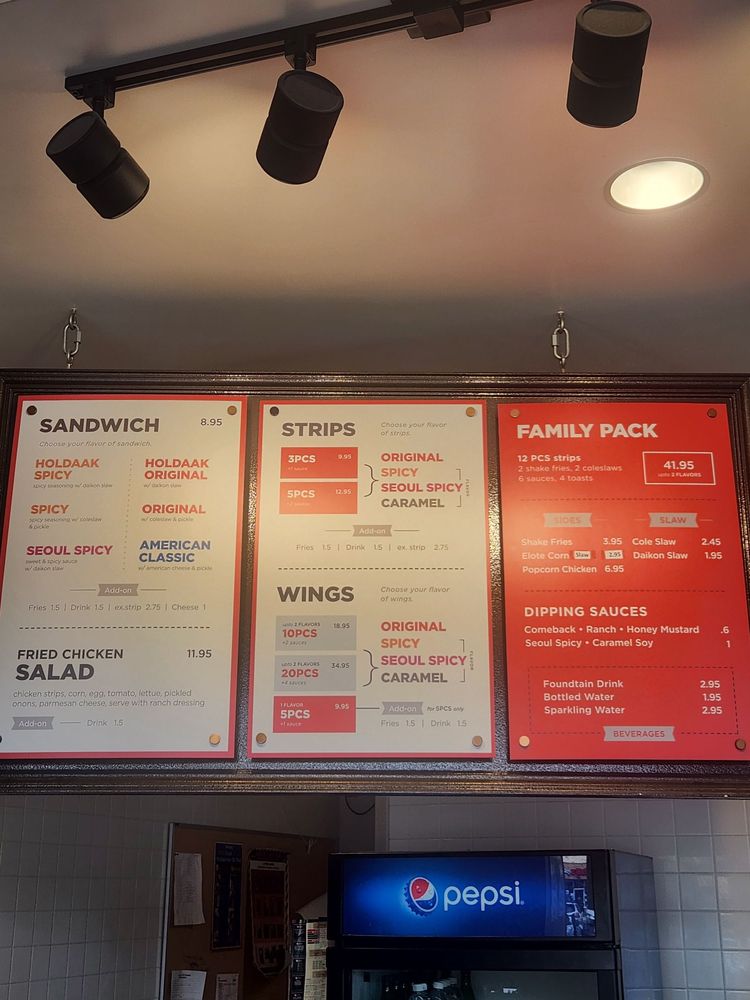 “ Pretty good. Got the original chicken sandwich and some strips with the Seoul spicy sauce. The sandwich was good. I'd say it's comparable to other chicken sandwiches, but maybe I'll try the spicy next time as it might have a little bit more flavor and kick than the original. The chicken strips were good, but that sauce is pretty spicy. It's not that spicy at first, but the heat sneaks up on you. The chicken strips were also a decent size. I loved the fries. Just something about crinkle cut fries that make them so much better than regular fries. The menu on the website looks a lot easier to read and looks a bit different than the menu at the restaurant. Glad I finally got to try this place. I want to come back and try some of the other stuff on the menu. ”
